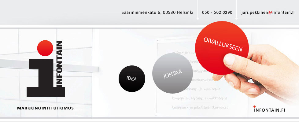 INFONTAIN OY Kilpailuetua asiakasymmärryksellä – Kuuntele asiakasta Vain syvällinen asiakasymmärrys johtaa todellisten kilpailuetujen saavuttamiseen. Asiakasymmärryksen kautta autamme asiakkaitamme tunnistamaan kilpailutekijät ja löytämään lisäarvoa tuottavat kilpailuedut. Yhdistämme kvalitatiivisen ja kvantitatiivisen tutkimuksen metodit parhaan mahdollisen lopputuloksen saavuttamiseksi. |